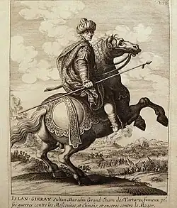 The Khmelnytsky Uprising of the Zaporozhian Cossacks against Poland started in January 1648 when Khmelnytsky became hetman of the Cossacks. In March Khmelnytski went to Crimea and made an anti-Polish alliance.[2] This gave him extra cavalry, mainly under Togay Bey. The Poles tried, with occasional success, to split the alliance. Crimean horsemen accompanied Khmelnytsky on this 1648 campaign when he got almost as far as Lviv. Next year İslâm helped win the Battle of Zboriv (1649). The withdrawing Tatars were permitted to ravage the country they passed through. Some claim that İslâm was bribed by the Poles and that he ravaged mostly Cossack territory.[3] In 1651 the Poles sent a large army and won the Battle of Beresteczko because the Tatars fled the field. Khmelnytsky went after them and was held hostage for a while by İslâm. In 1652, following the Battle of Batih, the Cossacks purchased the Polish prisoners from the Tatars and slaughtered them. Howorth says that in 1653 İslâm ravaged the country around Bar and Kaminetz and left after receiving a ransom.[4] Other sources have İslâm present at the Battle of Zhvanets at about the same time. In January 1654, by the Treaty of Pereyaslav, the Cossacks accepted Russian supremacy, thereby provoking the Russo-Polish War (1654–1667). İslâm died shortly after.
