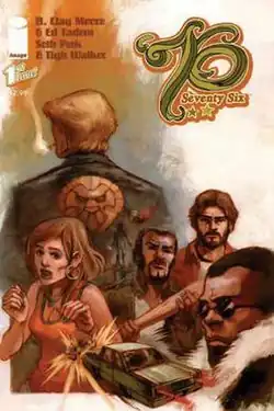 '76 is an eight-issue 2007 comic book limited series published by Image Comics, and written by B. Clay Moore and Seth Peck, and illustrated by Ed Tadem and Tigh Walker. Each issue of the mini-series, both set in the year 1976, focus on separate, ongoing storylines; one story takes place in New York City, and the other in Los Angeles. Both are crime dramas, drawn in monochrome and the series draws heavily upon 1970s 'street' culture.[1] The series has been reviewed as not so much "a flip-book" but instead "more like a drive-in double feature".[2]