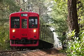 Five three-car 103–3000 series sets (numbered 51 to 55) were formed in 1985 from former 72–970 series EMU cars for use on the Kawagoe Line following electrification in September 1985. Five MoHa 72970 cars were also converted to SaHa 103-3000 cars to augment Ome Line trains. These cars were fitted with passenger-operated door controls. The five Kawagoe Line sets were lengthened to four cars between October 1995 and March 1996 ahead of Hachiko Line electrification in March 1996.[13][16] The last set was withdrawn in October 2005.