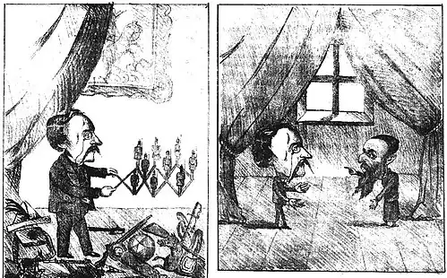 By then, the Concordia alliance was under strain, with the Factionalists, who were centered in Western Moldavia, pressuring government to inaugurate a working Court of Cassation at Focșani.[18] Visiting Bacău and Iași to canvass among the local liberals and thus create a moderate alliance, Brătianu was met by a riotous mob of Factionalist voters.[19] The continued discrimination against Jews also became a rally point for some conservatives (or "Whites"), including Vaslui deputy Petre P. Carp, who had a number of public disputes with the Interior Minister.[20] Despite their differences on the issue of emancipation, it became apparent that the "Whites", mostly aristocratic "boyars", were reaching out to the middle-class Factionalists, united in their rejection of "Red" liberalism. Factionalist deputies (including Alexandru Gheorghiu, Alecu D. Holban, Ioan Negură, and Ianache Lecca) attacked government at the same time as Carp, citing concerns about limitations on press freedom.[21] The left-leaning humorist Nicor satirized this alliance by claiming that the Factionalist senator Nicolae Ionescu was trying to pass for a "boyar" or "young lord", "avoiding democracy like the plague."[22]