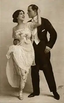 After dinner there was a demonstration of dancing by married couple Maurice Mouvet and Florence Walton.[8] The pair became the first American dancers to appear in a performance by royal command.[10] The tango, a relatively new dance, had been performed in Paris since around 1910 and had been danced in London since 1912, though it was opposed by the press due to its supposed immorality.[11] The dance gained popularity over the following two social seasons and it was originally scheduled to be performed at the Kenwood House ball.[11][12] It was rumoured at the time that Mary had banned the dance at the Royal Court and it was removed from the programme.[11][12]
