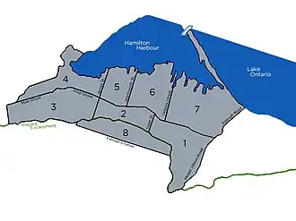 ![]() The wards of the City of Hamilton. Each ward sent two Alderman to city hall, in addition to four Controllers and one Mayor elected at-large. | ||||||||||||||||