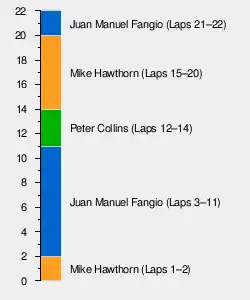Fangio had taken notice of the tyre and fuel-level selection of the Ferrari drivers, and realized they were probably going to run the entire race without a pit stop. Fangio decided he would use softer tyres, and only a half tank of fuel. This would allow the car to take corners faster, but also require a pit stop. Fangio took his pit stop on lap 13, in first place, and 30 seconds ahead of Hawthorn and Collins.