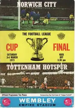 The 1973 Football League Cup Final was held on 3 March 1973 and was won by Tottenham Hotspur. Spurs beat Norwich City 1–0 at the old Wembley. After 12 different teams had won the League Cup in its first 12 seasons, Spurs became the first team to win the competition for a second time.[1]