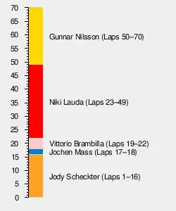 David Purley stayed out later than most drivers and was running third by lap 21.[1] After he finally pitted, he emerged in front of race leader Lauda. He was likely unaware that Lauda was a lap ahead and did not let him through, holding the leader up for a few laps. This may have cost Lauda victory and the two were involved in an argument after the race.[2]