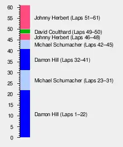 At the front of the field, Hill moved back into the lead of the race when Schumacher made his pit stop on lap 31, rejoining in second place with a deficit of 20 seconds.[37] Hill now pushed hard in his efforts to build up a sufficient lead over Schumacher—setting the race's fastest lap time of 1:29.752 on lap 37—to maintain first place after his second pit stop.[1] Salo began the second round of pit stops on the next lap, and was followed in due course by Alesi, Herbert, Barrichello, Boullion, Gachot, Blundell, Panis and Coulthard.[1] Coulthard's stop, despite moving him ahead of Alesi, was problematic: his car's electronic failure meant that his pit-lane speed-limiter system did not work, and he exceeded the 80 kilometres per hour (50 mph) pit-lane speed limit, an infraction of the Sporting Regulations which, like jumping the start, entailed a ten-second stop-go penalty.[17][35][38] Hill made his own second stop on lap 41 with a 27-second lead over Schumacher and the two were almost level as Hill reached the end of the pit lane, but Schumacher's extra momentum allowed him to move ahead in the run to the Maggotts, Becketts and Chapel sequence of fast corners.[29] At the completion of the scheduled pit stops by lap 44, the running order was Schumacher and Hill in close attendance, then a gap back to a similar battle between Herbert and Coulthard, then Alesi, Blundell, Barrichello, Panis, Frentzen—whom Panis had just passed for the third time—Martini, Badoer, Salo, Boullion, Gachot and Moreno, the last of whom retired four laps later with a lack of hydraulic pressure in his Forti's pneumatic engine valves.[1][14]