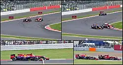 Vettel immediately made a second pit stop at the end of the lap. He rejoined ahead of Alonso in fifth place.[41] Alonso twice passed Vettel around the outside at Copse corner during a duel for fifth between laps 35 and 36.[39][40] On lap 37, Vettel had optimum tyre temperature,[41] and used DRS on the Wellington Straight to pass Alonso on the outside under braking. Alonso then went across the front of Vettel leaving Brooklands corner to retain fifth.[40] Vettel saw space to pass Alonso at Brooklands corner on lap 42, but the latter blocked his pass on the racing line.[37] Three laps later, Vettel turned to the outside of Luffield corner. Although he did not pass Alonso, Vettel entered the straight faster than the former who reacted by turning to the inside past the former Grand Prix pit lane to block him.[40] On the 47th lap, Vettel turned to the outside at Brooklands corner to draw alongside Alonso through Woodcote turn but Alonso kept fifth by braking later than him.[39][41]