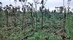 On June 11, Iberia and the western half of France came under the influence of a new high pressure system. Meanwhile, the frontal zone of the trough had almost reached the Alps, effectively cutting off the flow of hot and moist air into western and central Europe. Still, a large pocket of instability remained over eastern Germany, western Poland and parts of Czechia, where thunderstorm activity would focus on the last day of the outbreak.[30] Thunderstorms from the previous day in France had moved into central Germany after weakening overnight, but were able to gradually restrengthen again after sunrise. They grew upscale into an MCS around noon and reached northeastern Germany. A strong vortex embedded in this MCS spawned at least three tornadoes in southern Mecklenburg-Vorpommern, with the first one touching down at 1:37 pm. This tornado received an F1 rating after causing significant vegetation damage in a forest along a 2.2 km long path. At 1:40 pm, a second tornado touched down just to the north of the first tornado, and devastated a forest along a 3.7 km long track. This tornado was given an F2 rating. It is believed that both tornadoes coexisted for some time while being less than 2 km away from each other. The third tornado occurred at 1:58 pm and hit the village of Blumenhagen, damaging roofs and snapping trees. A pavilion was reportedly lifted 150 m into the air and thrown. The maximum damage along the 2.1 km long path was determined to be F1.[31] The storm cluster also produced large hail and severe winds, before moving off into Poland and dissipating later that evening. A windspeed of 113 km/h (70 mph) was recorded in Kyritz, Brandenburg, and 6 cm large hail was observed in Kodersdorf, Saxony.[20]
