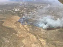 The fire started around 11:00 a.m. (MST) on June 20, 4 miles northeast of New River and quickly spread into the Tonto National Forest on same day it was first reported. In 24 hours, the fire had already grown to 3,956 acres (1,601 ha) caused by hot temperatures, strong winds, and dry fuel.[51] The fire eventually enlarged and expanded along the Top River Mesa. Multiple agencies quickly responded to the fast-moving inferno which was still moving northeast. They had also called air tankers since the fire was moving quickly due to strong winds and dry brush. By midnight on June 22, the fire had scorched 4,517 acres (1,828 ha). In the evening on the same day, it was announced that the fire was human-caused, but no specific cause was said.[52][53]