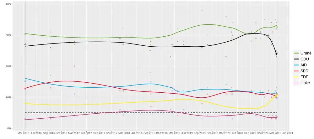 In the previous election held on 13 March 2016, The Greens became the largest party for the first time in any German state, winning 30.3% of votes cast. The CDU lost 12 percentage points, falling to second place on 27.0%. Alternative for Germany contested their first state election in Baden-Württemberg, placing third with 15.1%. The Social Democratic Party (SPD) lost almost half its voteshare and finished with 12.7%. The Free Democratic Party (FDP) won 8.3%.
