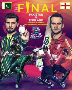 The 2022 ICC Men's T20 World Cup final was a Twenty20 International cricket match played at MCG in Melbourne, Australia on 13 November 2022 to determine the winner of the 2022 ICC Men's T20 World Cup.[2] It was played between England and Pakistan,[3] with both the teams eyeing their second ICC Men's T20 World Cup title.[4][5] England won the match by 5 wickets to win the title for the second time.[6] Having also won the 2019 Cricket World Cup Final, England became the first men's team to hold the ODI World Cup and T20 World Cup titles at the same time.[7]