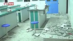 A total of 12,772 residents were affected and displaced.[21] Affected residents in Lushan were resettled in tents at a nearby school in Taiping. The school also served as a supply distribution center. Relief workers and resettled villagers reported that the walls of the school had cracks and shattered.[32]