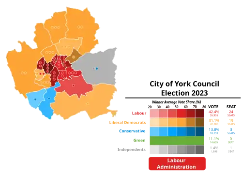 Elections to City of York Council took place on 4 May 2023, as part of the United Kingdom local elections .[ 1] [ 2] [ 3] They were held on the same day as other local elections in England. The incumbent leader of the council and leader of the Liberal Democrats, Keith Aspden did not stand for re-election, with it being announced ahead of the elections that Nigel Ayre would be the Liberal Democrats' new leader.[ 4]