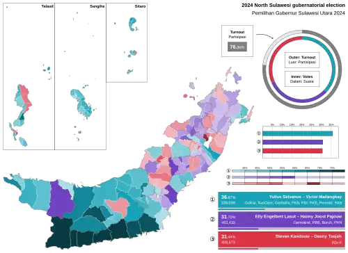 The 2024 North Sulawesi gubernatorial election was held on 27 November 2024 to elect the governor of North Sulawesi for a five-year term. They were held as part of local elections across Indonesia. The previous election was held in 2020. The election was won by Yulius Selvanus of the Gerindra Party with 36% of the vote. He defeated the Democratic Party's Elly Engelbert Lasut, who placed second, and Steven Kandouw of the Indonesian Democratic Party of Struggle (PDI-P).