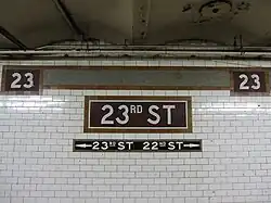 There are no open crossovers or crossunders between the platforms.[39] The platform extensions had beige tiles. During station renovations in 1988, the beige tiles were removed and the original, white ones restored. It has IND-style signs indicating the way to the exits at 22nd and 23rd Streets. An ornate fare control grille on the southbound side is a piece of artwork entitled Long Division by artist Valerie Jaudon, which was installed during the renovation.[40] The station features a back-lit "23 Street/Park Avenue South" sign at the platform level fare control. The station does not contain restrooms.
