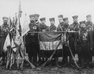 From its establishment in 1884 until the outbreak of World War I in 1914, the 4th Tunisian Tirailleurs wore the zouave style uniform of the Algerian tirailleurs. The distinguishing feature of the Tunisian regiment were light blue tombeaus (false pockets) on the front of their blue and yellow vestes (short jackets). Complete with red fezzes and waist sashes, this North African style of clothing was reintroduced for parade and off-duty wear in 1932. On other occasions the standard khaki service dress of the Army of Africa was usually worn.[5]