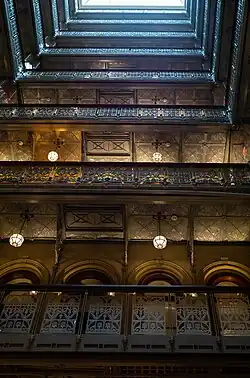 The entrance on the ground, or first, floor consisted of a T-shaped corridor with stores on either side, though the storefronts were removed in the 2000s.[40] After the building's 2010s renovation, there has been a bar room on the atrium's ground level.[44][45] Above are eight balcony levels surrounding the atrium, with encaustic tile floors. The outer walls of each balcony contain doors and windows leading to offices.[39] The balconies are held up by cast-iron brackets shaped like dragons.[22][39] The balustrades of each balcony are made of iron[29][46] and are decorated with foliate motifs, with wooden handrails above and newel posts at each corner.[47] The balcony levels have metal grilles with leaf patterns.[22][48] Each balcony level also has a metal floor hatch, through which heavy objects could be lifted.[39] Smoke curtains and a sprinkler system were used to protect the atrium from fire.[48] The second-story balcony, which had been removed at some point in the building's history, was restored in the 2010s.[48] In contrast to the other balconies, the second-story balcony served as a roof for ground-story stores on three sides.[45] The ninth-story balcony has modillions and glass canopies.[46]