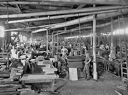 | Carts outside the factory carrying furniture made for the Royal Military College, about 1910 | Interior of the factory about 1913, before the huge fire | The factory about 1934, looking north-west; South Road is in the foreground | |||