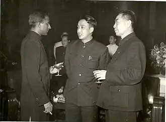 Chinese Premier Chou En Lai and his interpreter speaking to Moorthy, Ceylonese Charge d'Affaires, at a reception in Peking to celebrate the 10th anniversary of Ceylon's independence on 4 Feb 1958.