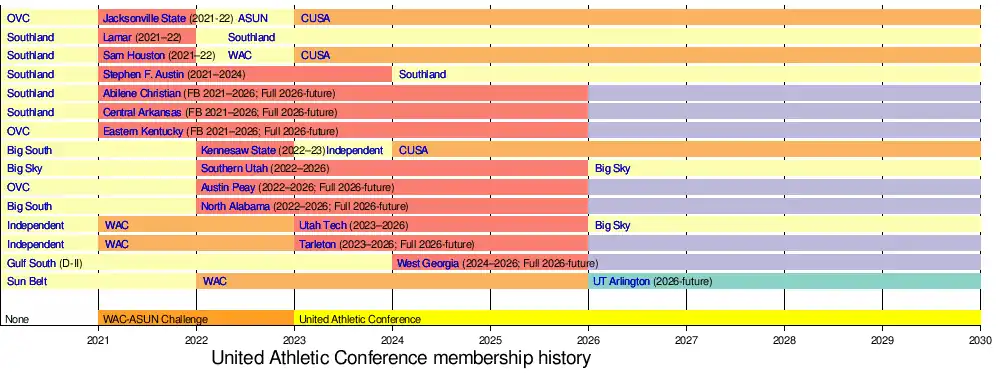 On June 26, 2025, shortly after Utah Tech and Southern Utah announced that they would be leaving the WAC and UAC to join the Big Sky Conference for all sports including football, the WAC and ASUN announced that the three remaining members of the WAC (Abilene Christian, Tarleton State, and non-football UT Arlington) and the five football-playing members of the ASUN (Austin Peay, Central Arkansas, Eastern Kentucky, North Alabama, and West Georgia) would become members of an all-sports version of the United Athletic Conference, effective July 1, 2026. The UAC would inherit the WAC's automatic qualifiers to NCAA championships, most importantly to the men's and women's Division I basketball tournament.[26] The joint statement framed the demise of the WAC as a "strategic alliance" of the WAC and the ASUN, under which the WAC would "rebrand" as the UAC while the non-football-playing members of the ASUN[a] continued to operate after July 1, 2026 as a non-football conference under the Atlantic Sun name. The "rebranding" tactic enabled the new all-sports UAC to avoid a new conference's customary waiting period to be eligible for NCAA automatic qualifiers. Plans called for the UAC and ASUN to operate as a "consortium" under ASUN commissioner Jeff Bacon.[27]