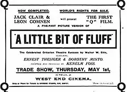 A Little Bit of Fluff is a 1919 British silent comedy film directed by Kenelm Foss and Geoffrey H. Malins and starring Ernest Thesiger, Dorothy Minto and Bertie Wright. The film is an adaptation of the popular stage farce of the same name by Walter W. Ellis.[1] Ernest Thesiger reprised his stage success as Bertram Tully, as did Alfred Drayton (Dr. Bigland) and Stanley Lathbury (Nixon Trippet).[2] The play was filmed again in 1928.[3] The 1919 version was made at the Kew Bridge Studios in London.