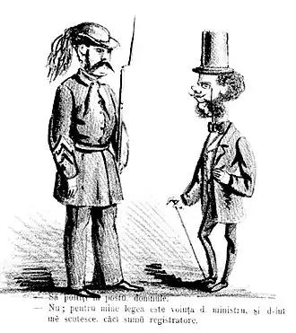 Actor and memoirist Mihail Belador was convinced that Nae Ipingescu was based on a real-life patrolman, Sandu of Dealul Spirii.[63] The character's baptismal name is the pet form of Nicolae ("Nicholas"), "very likely taken from children's jargon", while Ipingescu is formed by Caragiale from ipingea ("cloak"), adding the Romanian surname-suffix, -escu. The verbal suggestion is here is that Nae is of an "inferior social extraction, [with] an insipid job".[64] In the original play's dramatis personae, the ipistaf is introduced as Dumitrache's "political friend"—whereby Caragiale jibes at the trafficking of favors within the Civic Guard, and at Ipingescu's servile characteristics.[56] He adds a layer of comedy to Venturiano's prose in Vocea by displaying his own limited reading skill, and a disproportionate confidence in explaining the obscure terminology to his boss.[65] His own variant of Romanian mixes freely mahala insults with Latinate borrowings, for instance by using Constituțiune ("Constitution", as opposed to the modern Constituție) and idem.[66] His understanding of the word sufrágiu ("suffrage") as the near-homonymous sufragíu ("table-servant") appears earlier in Alecsandri's Iorgu de la Sadagura ("Iorgu of Sadagura"), as one of several elements shared by the two works.[67] Philologist and poet Octavian Soviany notes that Ipingescu's high respect for Venturiano as a Vocea writer is what ultimately makes Dumitrache welcome the intruder into his own "illusory space".[68]
