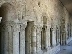 The abbey's Romanesque cloister stood on the site of today's Maine-et-Loire prefecture. It was built on the initiative of Robert de La Tour-Landry, abbot of Saint-Aubin from 1127 to 1154. All that remains is the eastern gallery with the Chapter house door and two series of arcades on either side. On the north side, they consist of two triplets of three arcades each. On the south side, they are composed of geminated bays beneath three framing arcades. These twelve arcades must have been built in the 12th century.