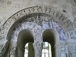 The doorway to the chapter house features three archivolt scrolls. The capitals on the cloister side depict episodes from the story of Samson. Under the archivolts of the southern arcades, the spandrels depict scenes depicting the Maestà and the story of David and Goliath. Beneath the representation of the Maestà, surrounded by two angels, is a painting showing, on the right, the Magi showing the star and setting off towards Jerusalem, on the left, Herod ordering the Massacre of the Innocents, and in the center, Jerusalem symbolized by the representation of the Virgin.