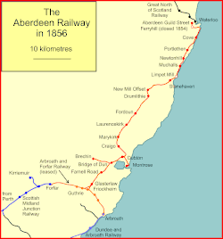 Early proposals for the Aberdeen Railway had envisaged it running from Forfar (at the termination of the Scottish Midland Junction line) via Brechin, but the bill as presented was for a junction with the Arbroath and Forfar Railway (A&FR) at Guthrie, about halfway between Arbroath and Forfar. This saved some mileage of new construction, but the track gauge of the A&FR would have to be changed. The line was to run a little to the west of Montrose and then follow the coast to Aberdeen. There were to be branches to Montrose and Brechin, and the Arbroath and Forfar line was to be leased to the Aberdeen Railway. The authorised capital was £830,000 and the Aberdeen Railway Act 1845 (8 & 9 Vict. c. cliii) was given royal assent on 31 July 1845, the same day as the Caledonian Railway and the SCR and the SMJR.[3][4]