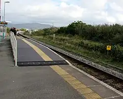 Originally a two-platform station with a short branch line (only a few hundred yards long) to the harbour, the station is now a single-platform, unstaffed halt. Like many stations in Wales and the North of England, the station was constructed before standard platform heights were established and is very low. Aberdovey was the third UK railway station to receive a specially designed raised section - a Harrington Hump - to improve accessibility for passengers. This was funded by the Welsh Government.[4][5][6] There are no ticketing facilities at the station, and there is also no waiting room. There is a free car park with 25 spaces.[7]