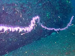 Abylopsis tetragona is a species of siphonophore in the family Abylidae. Abylopsis tetragona is a colonial organism, which is primarily gelatinous and measures about 1 cm. This species has an anterior nectophore as well as a posterior nectophore that is three times as wide. Both facets are less regularly pentagonal. A. tetragona has radial symmetry and has two basal teeth. This species has an exoskeleton of chitin and are almost entirely marine. The A. tetragona has two body forms; a polyp and a medusa. All hydrozoans have many cells that can form into two tissue types: epidermis and gastrodermis. Abylopsis tetragona's common name is siphonophore and can be defined as eurythermal and euryhaline, meaning that they can endure a wide range of temperatures and salinities. Siphonophores, at first sight, can be thought to be a long mega-animal, as seen in the picture to the right. But looking at it more closely, this mega-organism is made up of individual organisms called zooids (attached polyps medusae). Each zooid has a different role within the colony. Abylopsis tetragona lacks pneumatophores (which aid buoyancy), and has a nectophore. This means that A. tetragona uses its swimming bells to help with the locomotion of the colony. Siphonophores can form bioluminescent structures, enabling them to lure their prey and provide some defense mechanism against their predators. This species attaches itself to shells, seaweed, and other surfaces at the bottom of the ocean.