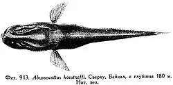 Abyssocottus korotneffi is a species of ray-finned fish belonging to the family Cottidae, the typical sculpins. These sculpins are endemic to Lake Baikal in Russia. [2] It is known to dwell at a depth range of 120–1,600 m (390–5,250 ft), most commonly between 460–500 m (1,510–1,640 ft). Males can reach a maximum total length of 12.6 cm (5.0 in) and females 13.2 cm (5.2 in). Maximum age is 12 years. Females harbour about 20 eggs in each ovary.[2]