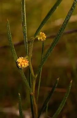 Acacia bynoeana, known colloquially as Bynoe's wattle or tiny wattle,[3] is a species of flowering plant in the family Fabaceae and is endemic to New South Wales, Australia. It is a low-lying shrub with narrowly elliptic to linear phyllodes, spherical heads of light golden yellow flowers, and tapered, firmly papery to crust-like pods.