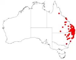 Curracabah is endemic to an area from south eastern Queensland to northern New South Wales in the south[4] where it is common in coastal areas from around the Mooloolah River in Queensland down to the Hastings River in New South Wales.[5] It grows on hillsides or plateaux in sandy or stony sandy loams, often over shale, as part of the understorey in Eucalyptus forest or woodland.[4]