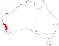 This species of wattle occurs in a discontinuous distribution from near Geraldton and south to Mogumber and Wongan Hills in the Avon Wheatbelt, Geraldton Sandplains, Jarrah Forest and Swan Coastal Plain bioregions of south-western Western Australia.[5]