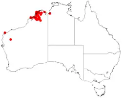 Acacia delibrata is a perennial shrub or tree growing to 9m in height, with a distinctive "minni ritchi" bark, flowering from April to June and in October. It is native to tropical Western Australia.[1][2] It is not listed as being a threatened species.[3] A crude saponin solution in water, prepared from the seed pods of a tree believed to be this species, was found to be severely irritant when applied to the eyes of a dog.[4]