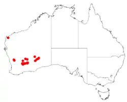 It is native to an area in the Goldfields-Esperance region of Western Australia where it is found on sand dunes, sandplains and flats growing in gravelly and sandy soils over laterite.[1] It has a scattered and disjunct distribution from around Southern Cross in the west to the Great Victoria Desert in the east.[2]