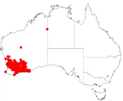 It is native to a large area in the Wheatbelt, Goldfields-Esperance, and Great Southern regions of Western Australia[1] and is found as far north as Eneabba, as south as Bremer Bay, and as east as Kalgoorlie.[3] It is typically found growing as a thicket amongst granite outcrops.[6]