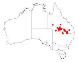 The tree has a scattered distribution across southern Queensland with a range that extends from around Adavale in the north west down to around the New South Wales border around Talwood where it is found growing in clay to shallow loamy soils over weathered rock as a part of open woodland along with Acacia cambagei or Eucalyptus thozetiana or sometimes forming dense stands of its own.[1]