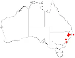It is native to a disjunct area in the northern and central tablelands of New South Wales.[2] The northernmost populations are found around Longford and Ebor and the southern populations are in the western Blue Mountains around Capetree and Cullen Bullen.[2]