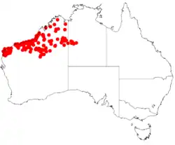 It is native to an area in the Kimberley, Pilbara and northern Goldfields regions of Western Australia. It is commonly found on flats, plains and sand ridges where it grows in stony sandy or clay soils.[2] It is mostly found from around the Exmouth Gulf in the south to around Broome in the north extending eastward into the Great Sandy Desert and the Tanami Desert in the Northern Territory. The shrub is usually found in soft spinifex communities especially those with Triodia pungens and Triodia epactia and in red sandy soils where A. stellaticeps can large, dense, pure stands.[1]