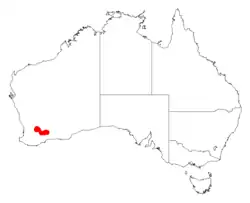 It is native to an area in the Wheatbelt region of Western Australia where is commonly situated on low ridges and rises growing in clay soils with lateritic gravel.[2] It is found around the Bruce Rock area in areas to the south west of Hyden where it is a part of open heathland communities.[3]