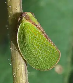 Acanalonia bivittata, the two-striped planthopper, is a species of planthopper in the family Acanaloniidae, and the most common and widespread member of the genus Acanalonia.[2][3] Adults of this species are typically green, though occasionally pink. There is a reddish stripe on the inner edge of the wing.[2]