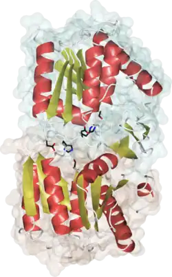 ![]() Crystal structure of human APT1, PDB code 1fj2. Alpha helices are in red, beta strands in gold, catalytic site residues in black. The 2 different monomers of the dimer are shaded in green and brown. | |||||||||