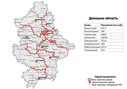 Until 2020, Donetsk Oblast was subdivided into 46 regions: 18 districts (raions) and 28 city municipalities (mis'krada or misto), officially known as "territories governed by city councils".[3][4] In 2014, the War in Donbas started, and whereas some areas are controlled by the central Ukrainian government, others are under control of separatists representing Donetsk People's Republic. The pro-Ukrainian government of the oblast was relocated from Donetsk to Mariupol.