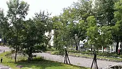 There is a playground with some playground equipment, two basketball courts, and two volleyball courts in the school yard. The school also has access to the university's track and swimming pool.