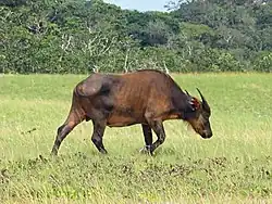The African forest buffalo (Syncerus caffer nanus), also known as the dwarf buffalo, red buffalo,[1] Congo buffalo or bush-cow,[2] is the smallest subspecies of the African buffalo.[3] It is related to the Cape buffalo (Syncerus caffer caffer), the Sudan buffalo (Syncerus caffer brachyceros), and the Nile buffalo (Syncerus caffer aequinoctialis). However, it is the only subspecies that occurs mainly in the rainforests of Central Africa and Western Africa, with an annual rainfall around 1,500 mm (59 in).[4] It has been proposed to represent a distinct species, Syncerus nanus.[5]