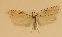 The wingspan is 19–23 mm. The forewings are whitish ochreous, more or less suffused with fuscous and sprinkled with dark fuscous; costa spotted with dark fuscous; first discal stigma and a dot obliquely before and above it black; second indistinct, dark fuscous; a dark fuscous spot between and above these; dark fuscous terminal dots. Hindwings are pale whitish-fuscous. The larva is green, paler laterally; dorsal and subdorsal lines dark green; dots blackish; head light brownish-ochreous; 2 with two blackish spots.[1]