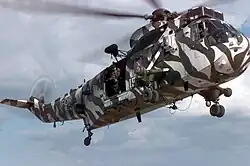 Ground camouflage is used to delay visual acquisition from the air of an aircraft that is on or near the ground. Light sand has been used for aircraft used over deserts, blues and greys for aircraft over the sea, and greens and browns for aircraft that are expected to operate in forested areas.[31] However, a camouflaged aircraft either on the ground or flying low over the ground in bright sunlight remains vulnerable to being detected from above because of its own shadow cast on the ground.[32] This can reduce an aircraft's camouflage effectiveness at altitudes up to 3,000 feet (910 m), particularly if the ground surface is pale and relatively uniform.[32] Helicopters are often painted in ground camouflage, sometimes in regional or seasonal forms such as snow camouflage.[33] Fixed-wing aircraft, too, are occasionally painted with snow camouflage, as for example on Soviet fighters[34] and Luftwaffe Stukas on the Eastern Front in winter,[35] in Swedish trials in 1970,[36] and RAF Jaguars on exercise in Norway.[37][a]