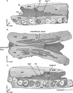 The holotype was recovered from an unspecified location in the sea cliffs near the original Santa Barbara Lighthouse in 1909, which is believed to most likely be part of the Monterey Formation. The whale was originally placed in the genus Ontocetus in 1925 by American naturalist Remington Kellogg as O. oxymycterus.[1][4][5] This genus was originally thought to represent a sperm whale, however, in 2008, the type species, Ontocetus emmonsi, was discovered to actually be a walrus. The whale was then moved to the wastebasket taxon Scaldicetus,[6] which consists of various other (more-or-less unrelated) primitive sperm whales with enamel coated teeth. In 2015, the whale was moved to the newly erected genus Albicetus.[2]